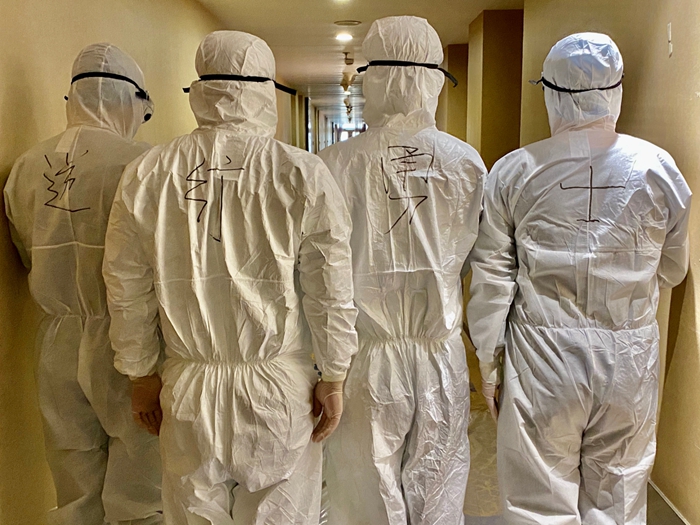 这样的默默坚守,在乐鱼leyu 一线服务人员身上更得到充分彰显。在红区工作的13名服务人员,每天要穿着厚厚的防护服为集中观察人员送餐、送物品、搞清洁卫生。每天,他们要全副武装穿上防护服,并严格按照要求进行消杀。要一个房间一个房间地配送餐食,送餐完毕,还要一个房间一个房间地收纳垃圾。由于防护服不透气,刚一行动起来,他们已经浑身是汗,但是他们每次都保质保量按时完成了任务。请记住他们的名字:崔涛、陈宇、翟明星、于艳梅、任艳丽、吴迪、崔加伦、刘克云、孙家俊、单雪芳、杜迪、杨鲁琦、侯迪。